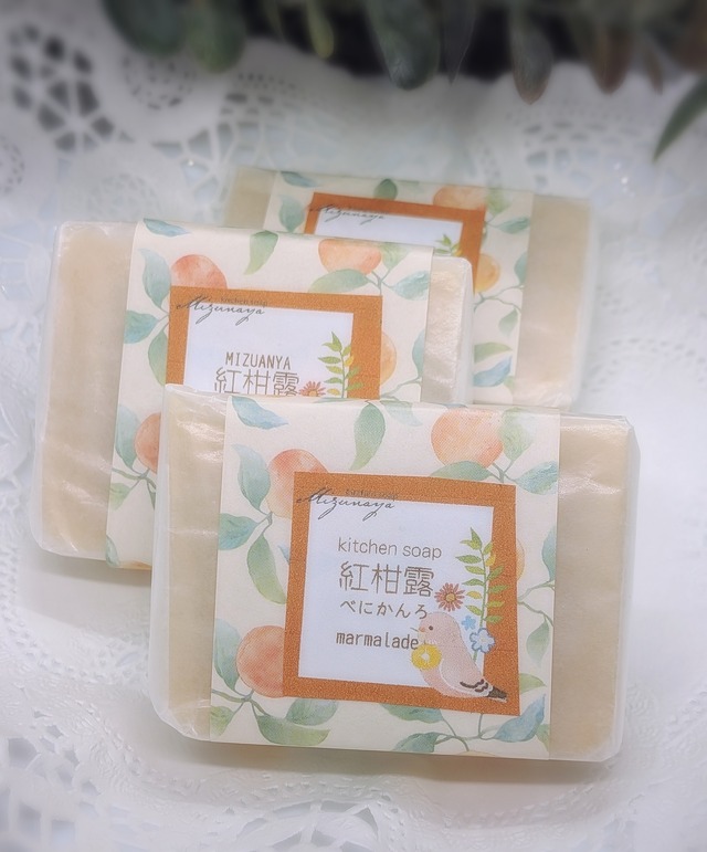 【材料】 オリーブオイル パームオイル ココナツオイル キャスターオイル ホホバオイル 紅柑 蜜 天然湧水 NaOH オレンジブラッドEO 文旦EO 白ショウガFO グレープフルーツFO 土佐の山あいでのんびり育った香り高い真っ赤なみかん。 紅柑を完熟でマーマレードにして入れたさわやかな柑橘のレシピです。 【標準量】 70g前後(カット時) ※熟成過程で水分が蒸発しますので少し軽くなります 旧薬事法の関係で雑貨石けんとしての頒布となります。 包装は合うものを使用しておりますが、変わる場合がございます