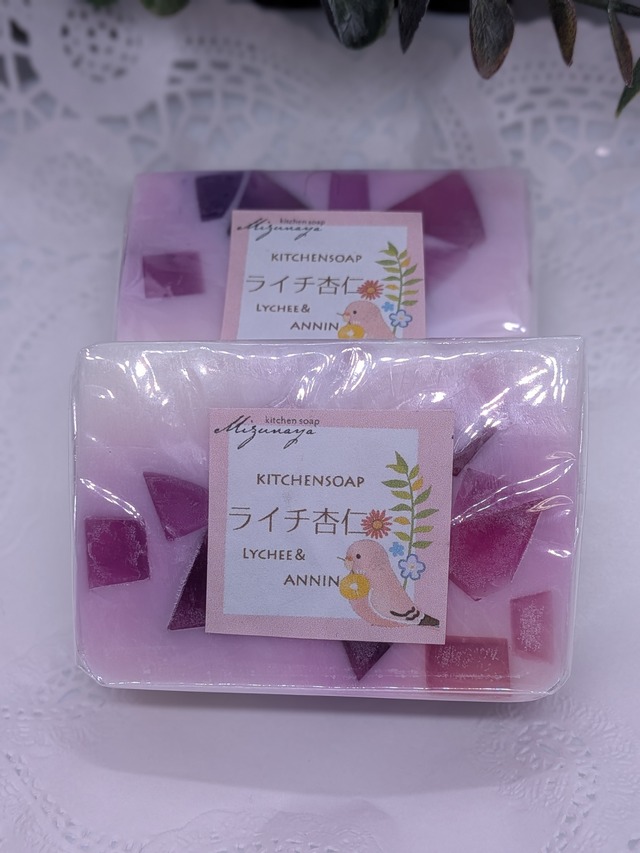 【材料】 サフラワーオイル パームオイル ココナツオイル グラニュ糖 植物性グリセリン 杏仁霜 天然湧水 NaOH アーモンドFO ネロリFO アプリコットFO カラージェル(橙、紫、ワイン) 杏仁霜とオイルを合わせて泡立ちの良い石けんを作りました。まるで杏仁豆腐そのもののようなさわやかな香りと細やかな泡立ちで甘さはスッキリのレシピです。 ライチ杏仁は香りは新作となります。あんずよりも爽やかです。 *こちらは作成オイルの性質で、柄にロット差が大きい商品となります。 【標準量】 70g前後(カット時) ※熟成過程で水分が蒸発しますので少し軽くなります 旧薬事法の関係で雑貨石けんとしての頒布となります。 包装は合うものを使用しておりますが、変わる場合がございます 天然素材の影響により、マーブルはロットによって出方に違いが生じます。単色の場合もあります。写真2や3もご参考ください。