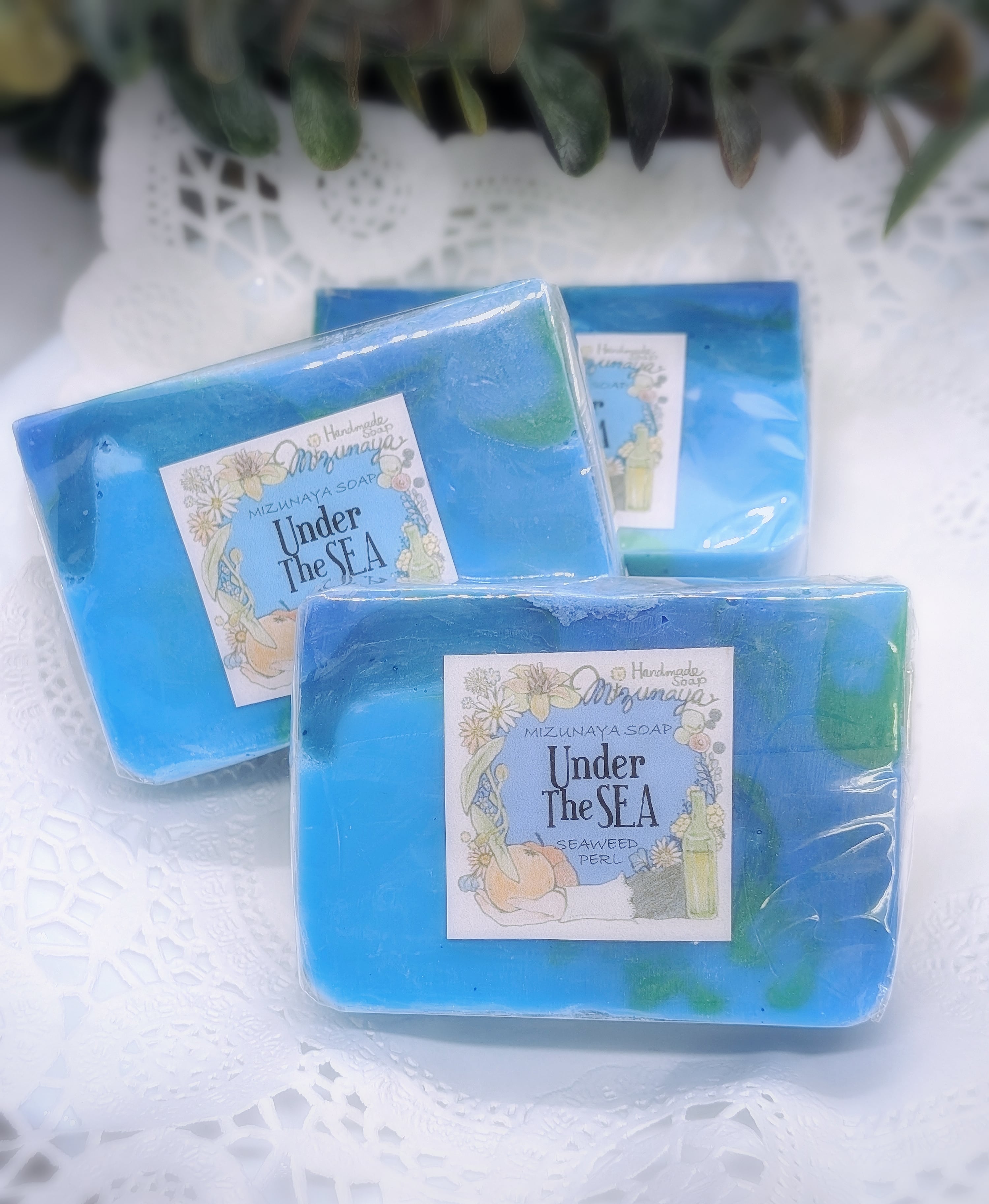 海の中の世界をイメージしたコンセプト石けん。マリンカラーのベースに、シーウィード(海藻)や本物の真珠のパウダー。砂に見立てたのは海藻の粒です。