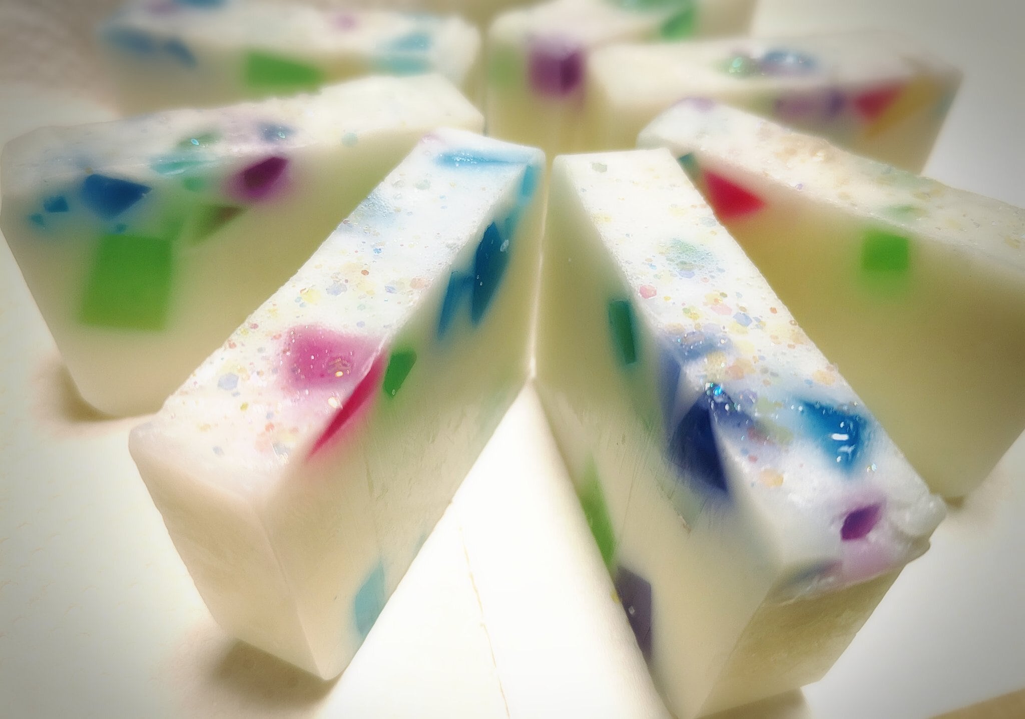 ベジタブルオイルの石けんに更に植物性グリセリン、糖分、エタノールの力で透明化したレシピです。通称「グリセリン石けん」です。